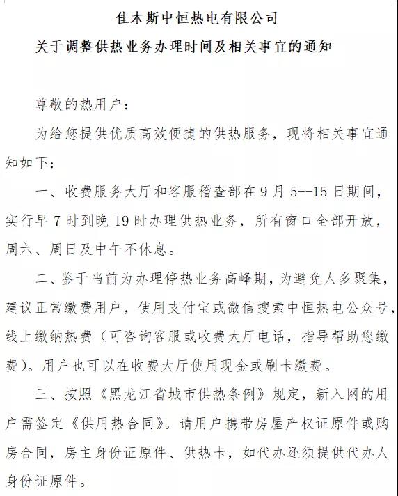 需要辦理停止供熱,恢復(fù)供熱的用戶,按照《黑龍江省城市供熱條例》規(guī)定,請您于2021年8月1日至2021年9月15日期間持客戶身份證原件、房屋產(chǎn)權(quán)證原件到威立雅服務(wù)廳辦理。