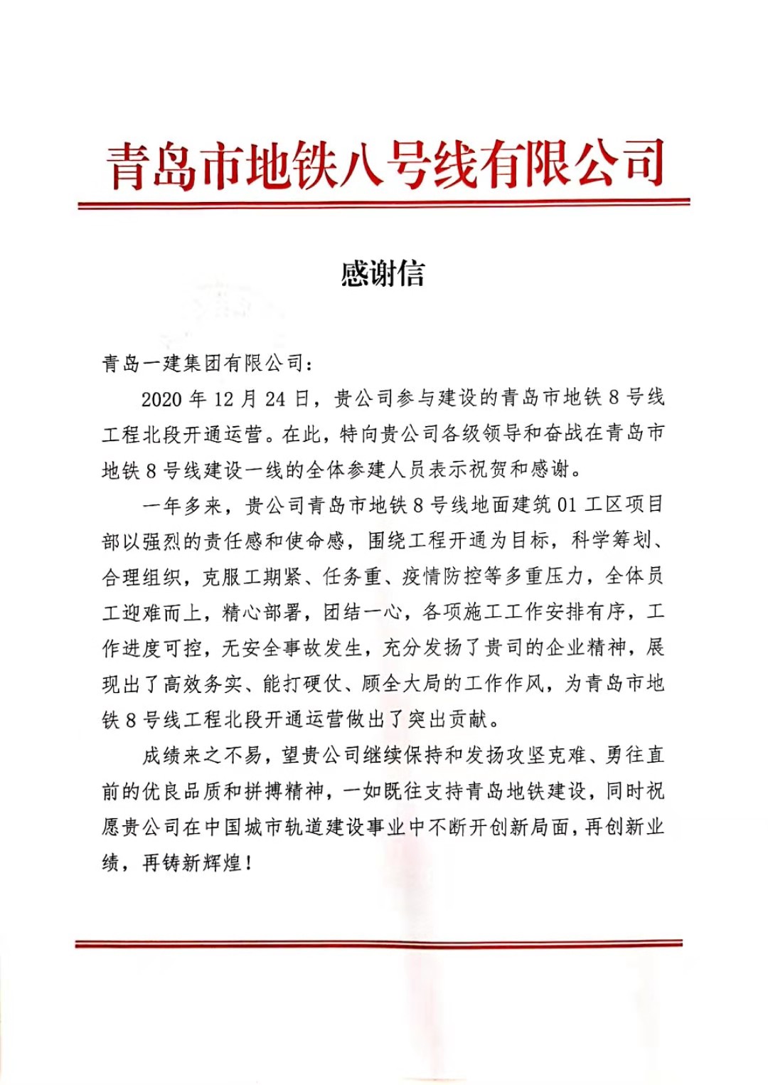 近日,青島一建集團(tuán)有限公司收到了來自青島市地鐵八號(hào)線有限公司的賀信。賀信中對(duì)青島一建集團(tuán)有限公司參與地鐵8號(hào)線項(xiàng)目承建的各級(jí)領(lǐng)導(dǎo)與一線工作人員表示祝賀與感謝。